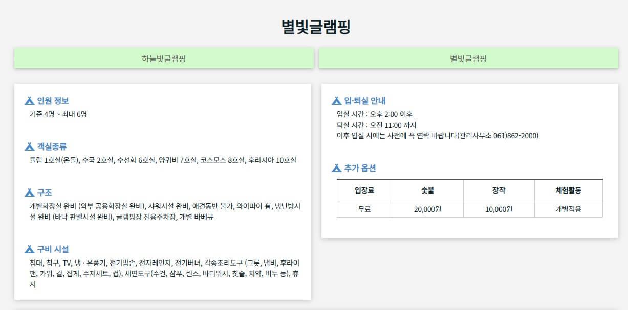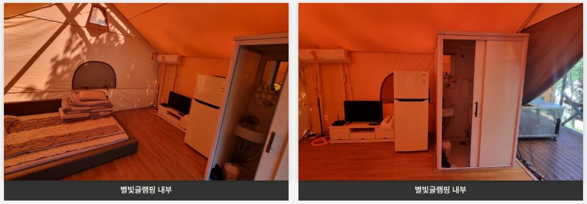 | 별빛 글램핑 | 주중 | 200,000원 | 성인 10,000원 / 아동 10,000원 |